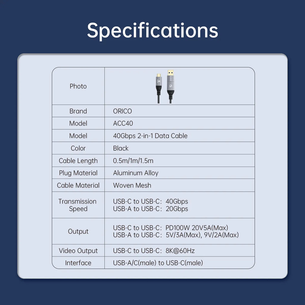 كابل نقل بيانات 40Gbps برأسين Type-C/A